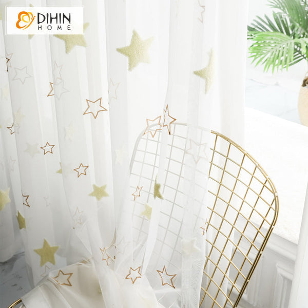 DIHIN HOME Cartoon White Stars Embroidered,Sheer Curtain,Grommet Window Curtain for Living Room ,52x63-inch,1 Panel