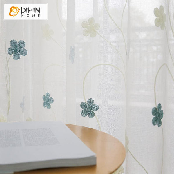 DIHIN HOME Pastoral Blue Flowers Embroidered,Sheer Curtain,Grommet Window Curtain for Living Room ,52x63-inch,1 Panel