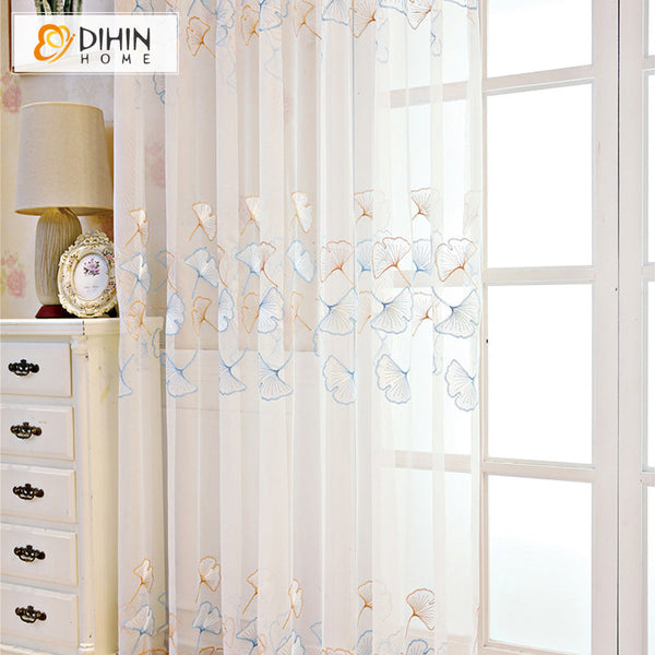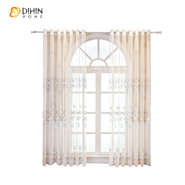DIHIN HOME Pastoral Gingko Flower Embroidered,Sheer Curtain,Grommet Window Curtain for Living Room ,52x63-inch,1 Panel